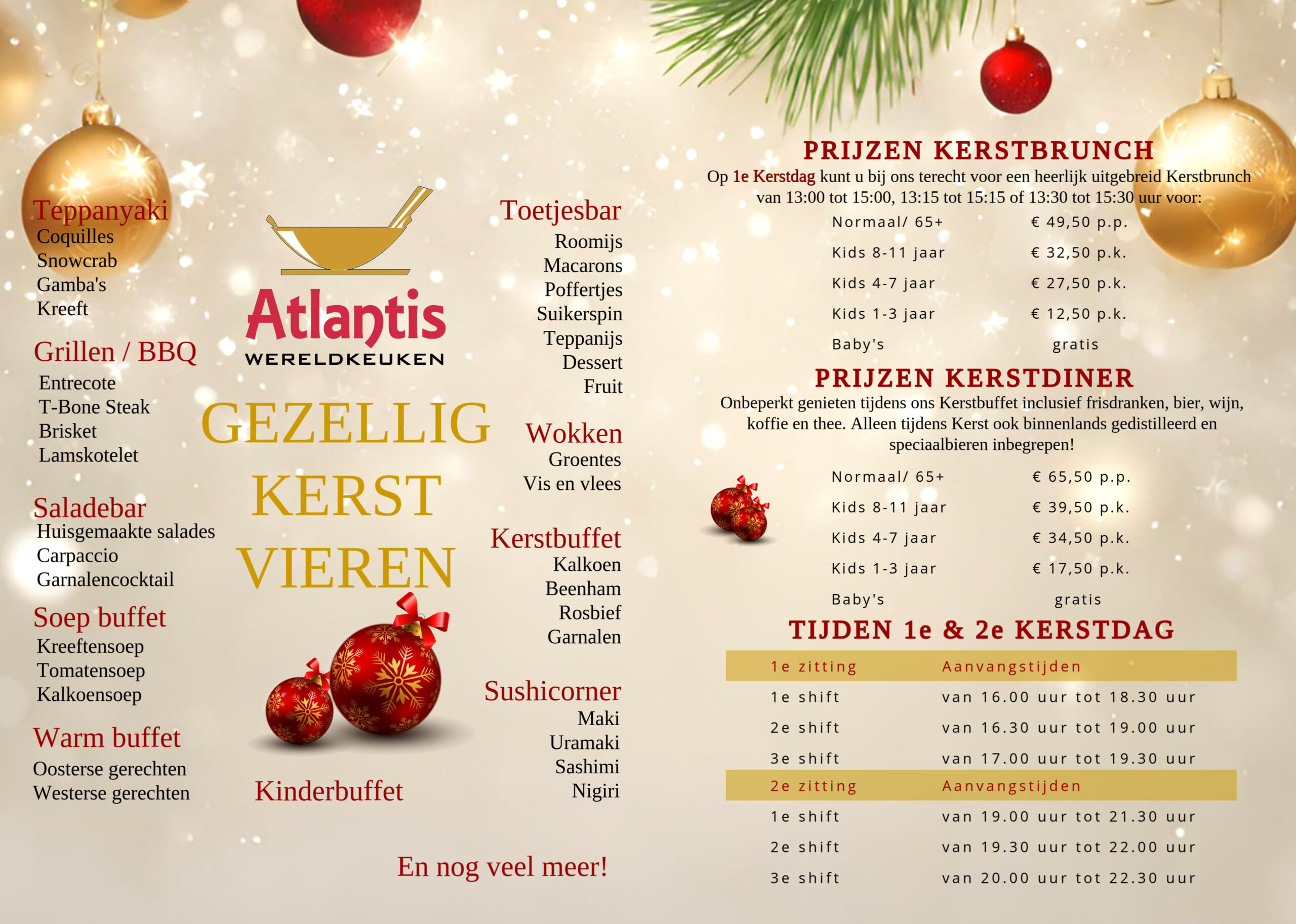 Op zoek naar een bijzondere kerstervaring? Dit jaar belooft Kerst bij Atlantis spectaculairder te worden dan ooit tevoren! Wij nodigen u van harte uit in ons sfeervol versierde restaurant om samen de feestdagen te vieren. Tijdens Kerst 2025 presenteren we een exclusief feestbuffet dat iedereen zal verrassen. Geniet van een uitgebreid aanbod, inclusief diverse soepen, extra wildgerechten, wereldse smaken van Japanse en Europese keukens, smaakvolle wokgerechten, en als kers op de taart, een grandioos dessertbuffet.